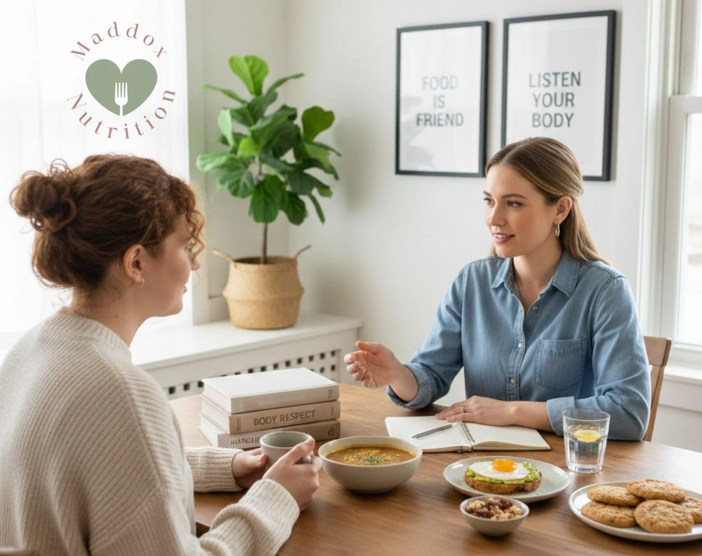 Our dietitians at Maddox Nutrition work from a non-diet, weight-neutral approach that reflects the same principles discussed here: consistent nourishment, reduced food fear, and care that honors both physical and emotional health.